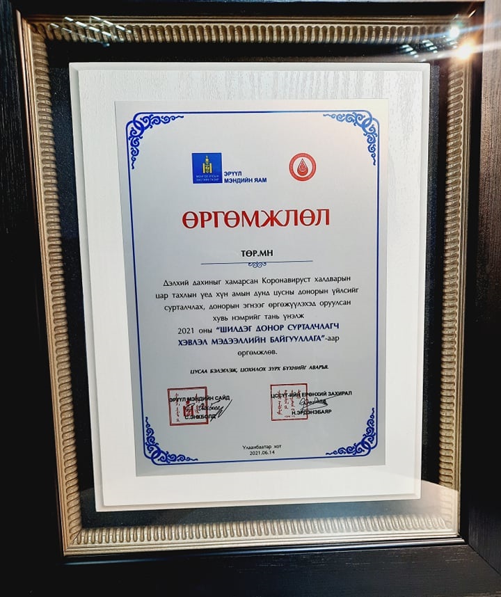 Өргөмжлөлийг ЭМЯ-ны төрийн нарийн бичгийн дарга Ц.Эрдэнэбилэг, Цус сэлбэлт судлалын үндэсний төвийн ерөнхий захирал Н.Эрдэнэбаяр нар гардуулан, баяр хүргэж амжилт хүслээ.