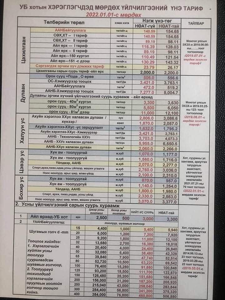 Улаанбаатар хотын төвийн 6 дүүрэг, Налайх дүүргийн хэрэглэгчийн усны үйлчилгээний тарифыг өөрчилсөн байна. Усны үйлчилгээний зардалд зайлшгүй нөлөөлөх хүчин зүйлсүүд байдаг аж.