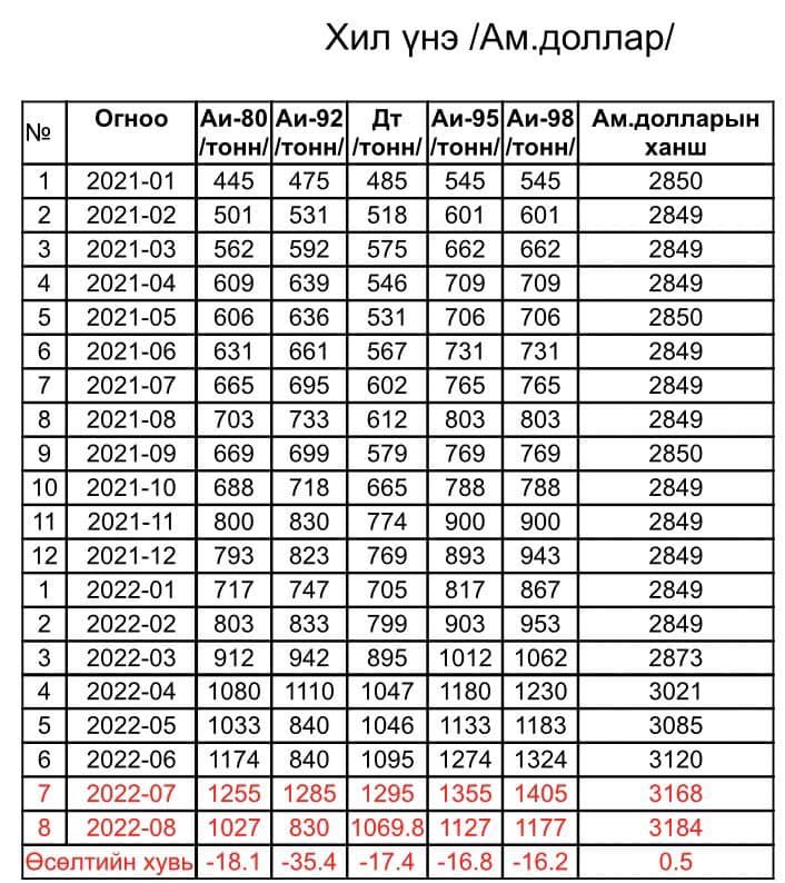 ОХУ-ын Роснефть компаниас 2022 оны 08 дугаар сард манай улсад нийлүүлэгдэх А-80, Аи-95, Аи-98 автобензиний импортын хил үнэ тус бүр 18.1, 16.8, 16.2 хувиар, дизель түлш 17.4 хувиар тус бүр буурсан байна. Иймд 8-р сард орж ирсэн дотоодод худалдаалагдах Дизель түлш болон Аи-80, Аи-95, Аи-80 автобензиний литр тутмын үнэ бууж 6 дугаар сарын түвшинд очих боломжтой байна.