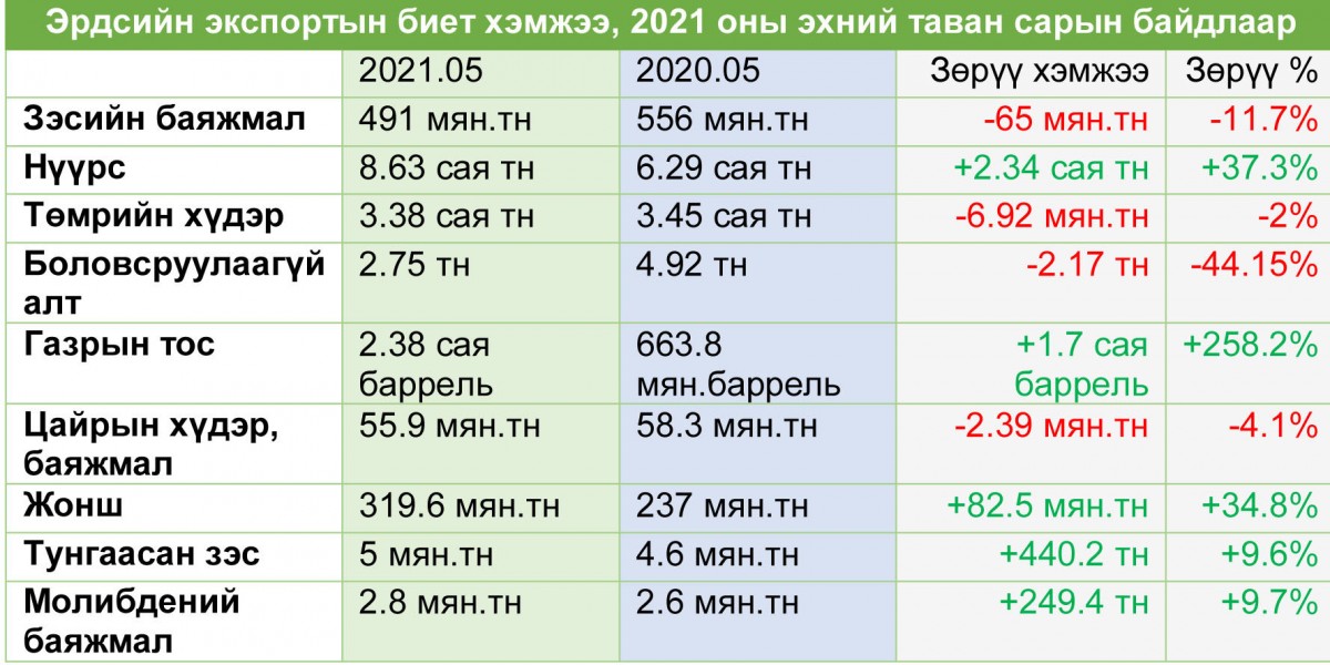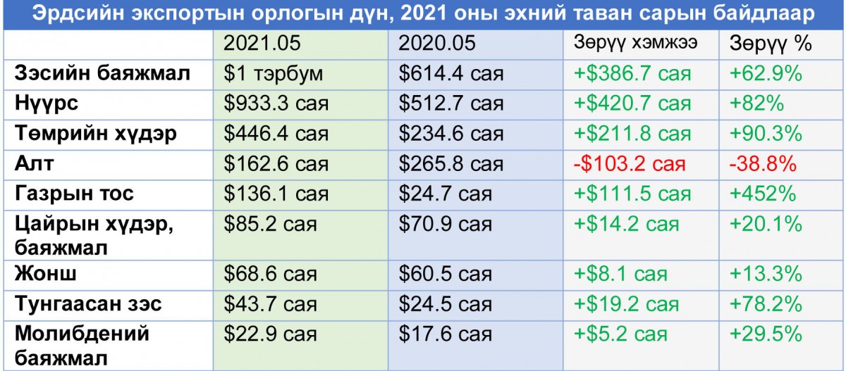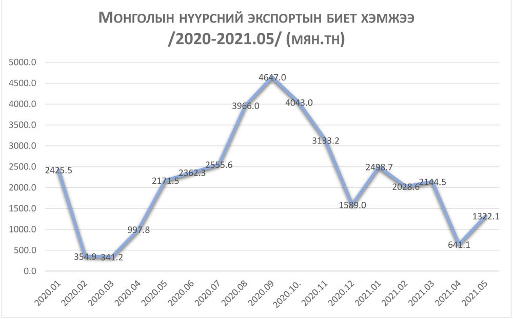 Нүүрсний экспортын тухайд оны эхний таван сард 8.63 сая тонн нүүрс буюу өнгөрсөн оны мөн үеийнхээс 37.3 хувиар нэмэгдсэн дүнтэй гарлаа. Энэ хугацаанд нүүрсний экспортын орлого 933 сая ам.доллартай тэнцэж 82 хувиар өссөн байна.
