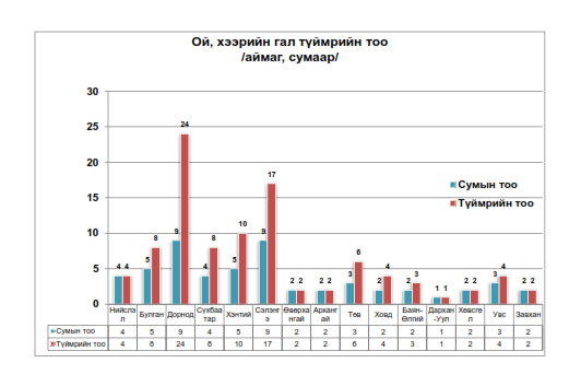 Улсын хэмжээнд он гарсаар энэ сарын 22-ны өдрийн байдлаар Архангай, Баян-Өлгий, Булган, Дархан-Уул, Дархан-Уул, Дорнод, Хэнтий, Сүхбаатар, Сэлэнгэ, Өвөрхангай, Төв, Ховд, Хөвсгөл, Увс, Завхан зэрэг 14 аймгийн 51 сум, нийслэлийн 4 дүүрэгт нийт 97 удаагийн ой, хээрийн гал түймэр бүртгэгдсэн байна.