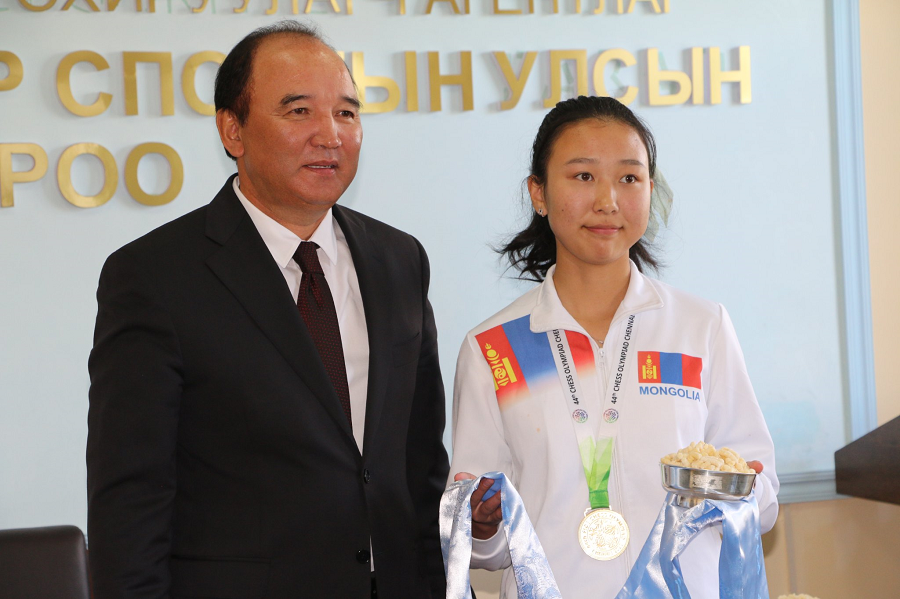 Мөн их мастерын болзол биелүүлсэн Т.Мөнхзулыг Засгийн газрын 2018 оны 173 дугаар тогтоолын дагуу мөнгөн урамшуулал (30 төгрөг)-ын батламж гардууллаа. Дараа нь Д.Жаргалсайхан дарга Монгол Улсын Ерөнхий сайд Л.Оюун-Эрдэнийн дэлхийн шатрын олимпиадад өндөр амжилт үзүүлсэн баг тамирчидадаа хандан баяр хүргэж, амжилт хүссэнийг энэ үеэр уламжилсан юм. Д.Жаргалсайхан дарга хэлэхдээ “Манай улс шатрын шигшээ багтай. Үүнийг үргэлжлүүлэх нь зүйтэй гэж үзэж байна. Энэ жил төсвийн хэмнэлтийн хуулийн дагуу зардал мөнгө тааруу байгаа нь үнэн.