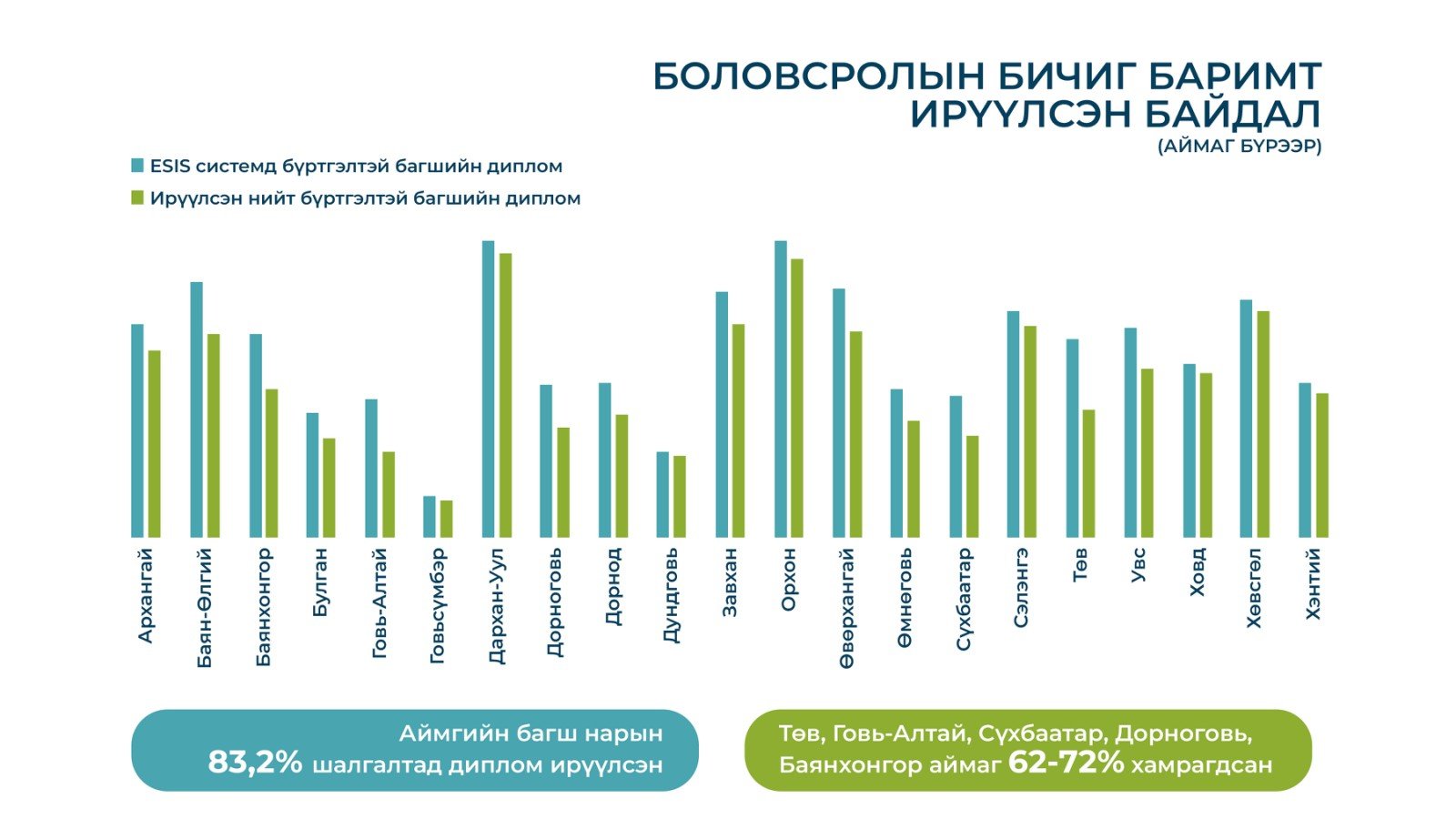 БШУЯ, МХЕГ хамтран 6 сарын туршид ЕБС, СӨБ-ийн байгууллагад ажиллаж байгаа багш нарын боловсролын баримт бичигт шалгалт хийж дууслаа. Дээрх хоёр салбарт 51 мянган багш ажиллаж байна. Тэдний 71 мянган дипломыг шалгахаар ажлын хэсэг байгуулагдсан. Гэхдээ шалгалтад 12 мянган багш диплом, бичиг баримтаа ирүүлээгүй байна.