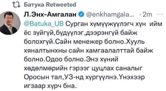 Сурган хүмүүжүүлэгч хүн ийм ёс зүйгүй,бүдүүлэг,дээрэнгүй байж болохгүй.Сайн менежер болно.Хууль хяналтынхны сайн хамгаалалттай байж болно.Одоо болно.Энэ хүний хөдөлмөрийн гэрээг цуцлах саналыг Оросын тал,УЗ-нд хүргүүлнэ.Үнэхээр игзаар хүрч бна.