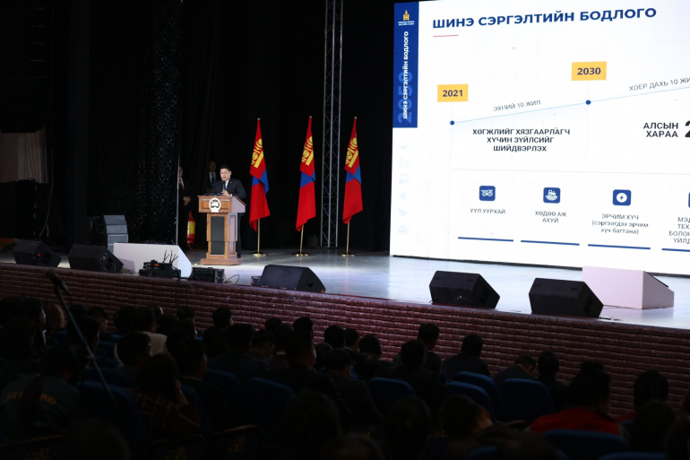 Засгийн газраас “Алсын хараа-2050” Монгол Улсын урт хугацааны хөгжлийн бодлогын эхний 10 жилийн зорилтыг “Шинэ сэргэлтийн бодлого”-д тусган батлуулж, хэрэгжүүлж эхлээд буй. Энэ хүрээнд боомтын хүчин чадлыг нэмэгдүүлж, авто болон төмөр замаар холбох, эрчим хүчний шинэ эх үүсвэрүүдийг нэмэх, аж үйлдвэрийн салбарт томоохон төслүүдийг хэрэгжүүлэх, хот хөдөөгийн хөгжлийн тэнцвэрийг хангах, ногоон хөгжил, төрийн бүтээмжийг сайжруулах бодлогын ажлууд хийгдэж буйг Ерөнхий сайд Л.Оюун-Эрдэнэ танилцууллаа.