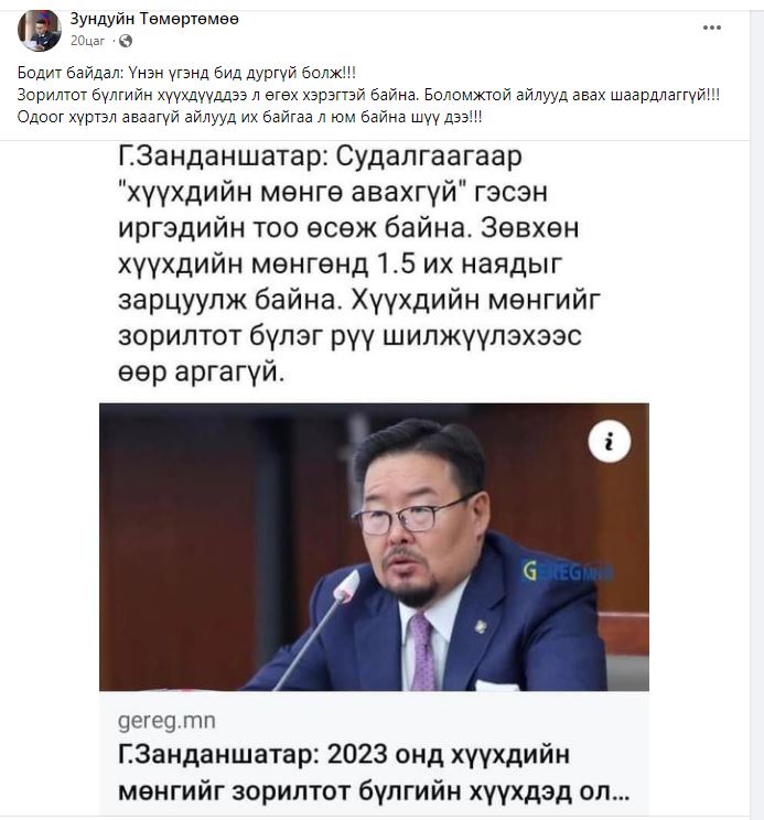 Өчигдөр УИХ-ын дарга Г.Занданшатар хэлэхдээ “Хүүхдийн 100 мянган төгрөгийг АВМААРГҮЙ байна гэх иргэдийн тоо өсөж байна. Иймээс энэ мөнгийг зорилтот бүлэг руу шилжүүлэхээс өөр аргагүй” гэж мэдэгдсэн. Энэ судалгааг ард иргэдээ УЛНЫ гэж доромжилж, ялгадаг Д.Сарангэрэлийн Хөдөлмөр нийгмийн хамгааллын яамнаас гаргасан гэнэ.