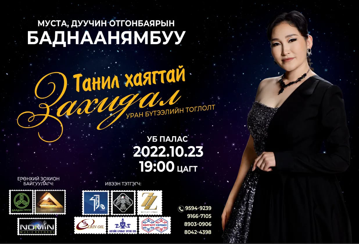 О.Баднаанямбуу дуучин маань “Туулын урсгал шөндөө сайхан” “Монгол сайхан эрчүүд” “Дөрвөн уул” гэх мэт олон сайхан дуунуудыг өөрийн нарийн мэдрэмж, намба төрх, уран нугалаа айзамыг хослуулан урласаар байна. Тэгвэл дуучин МУСТА О.Баднаанямбуу маань “ТАНИЛ ХАЯГТАЙ ЗАХИДАЛ” нэртэй бие даасан тоглолтоо энэ сарын 23-ны өдөр UB пласын концертын их танхимд хийхээр төлөвлөжээ. Эрхэм сонсогч та бүхнийг нэгэн үдэш он цагаар аялаж өнгөрүүлэхийг урьж байна.