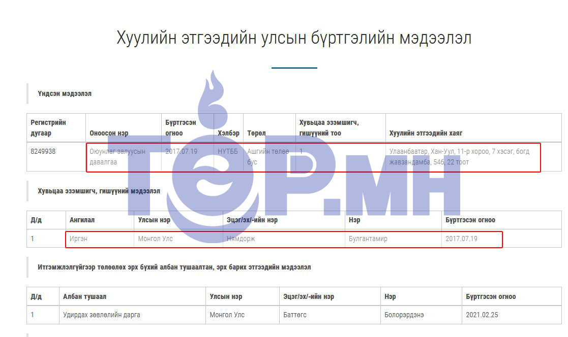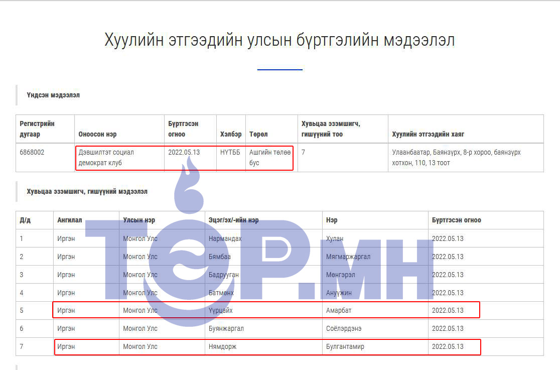 Харин Оюунлаг залуусын давалгаа ТББ-ын үүсгэн байгуулагч нь Нямдорж овогтой Булгантамир гэх хүн бий бөгөөд тэрбээр Дэвшилтэд социал демократ клуб ТББ-ын удирдах зөвлөлийн гишүүнээр ажилладаг нь УБЕГ-ын хуулийн этгээдийн бүртгэлд илхэн байна.