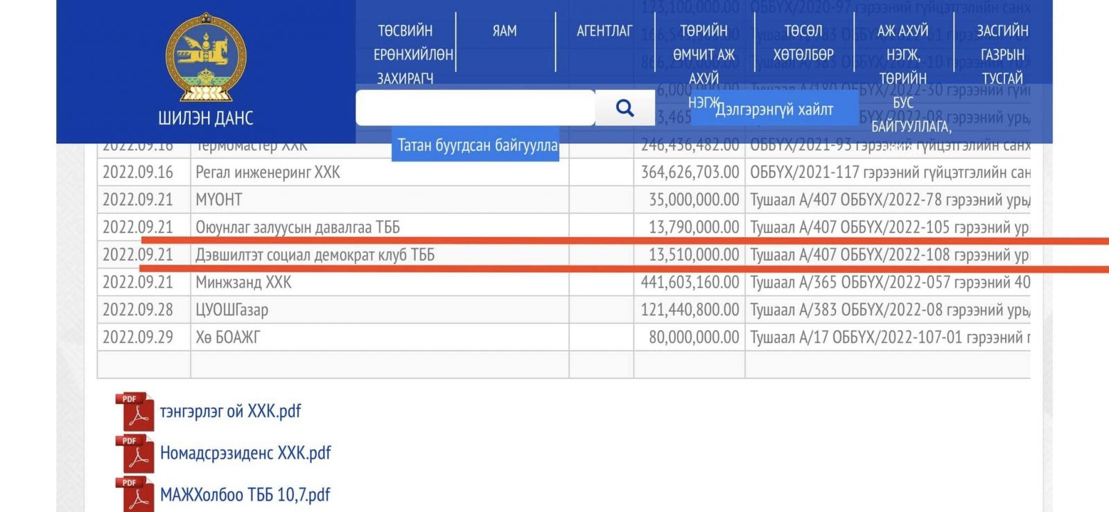 Байгаль орчин, аялал жуулчлалын сайд Б.Бат-Эрдэнэ Оюунлаг залуусын давалгаа ТББ, Дэвшилтэд социал демократ клуб ТББ-уудтай гэрээ байгуулж, тус бүр нь 13.8, 13.5 сая төгрөгийг энэ оны есдүгээр сард шилжүүлсэн байна.