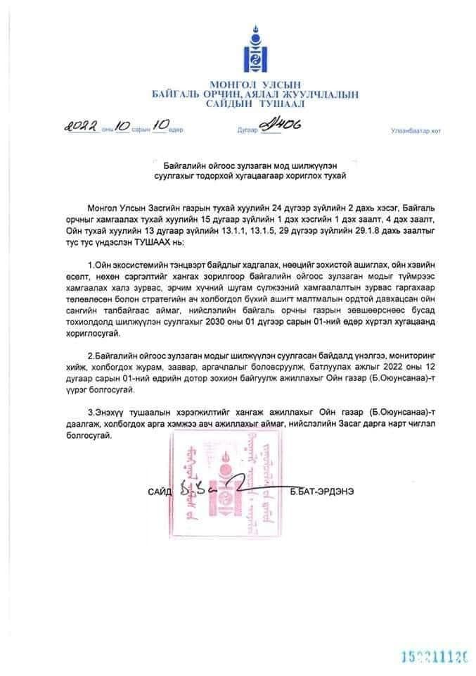 Тодруулбал, ойн экосистемийн тэнцвэрт байдлыг хадгалах, нөөцийг зохистой ашиглах, ойн хэвийн өсөлт, нөхөн сэргэлтийг хангах зорилгоор байгалийн ойгоос зулзаган модыг түймрээс хамгаалах халз зурвас, эрчим хүчний шугам сүлжээний хамгаалалтын зурвас гаргахаар төлөвлөсөн болон стратегийн ач холбогдол бүхий ашигт малтмалын ордтой давхацсан ойн сангийн талбайгаас аймаг, нийслэлийн Байгаль орчны газрын зөвшөөрснөөс бусад тохиолдолд шилжүүлэн суулгахыг 2030 оны нэгдүгээр сарын 1-ний өдөр хүртэл хугацаанд хориглож байна.