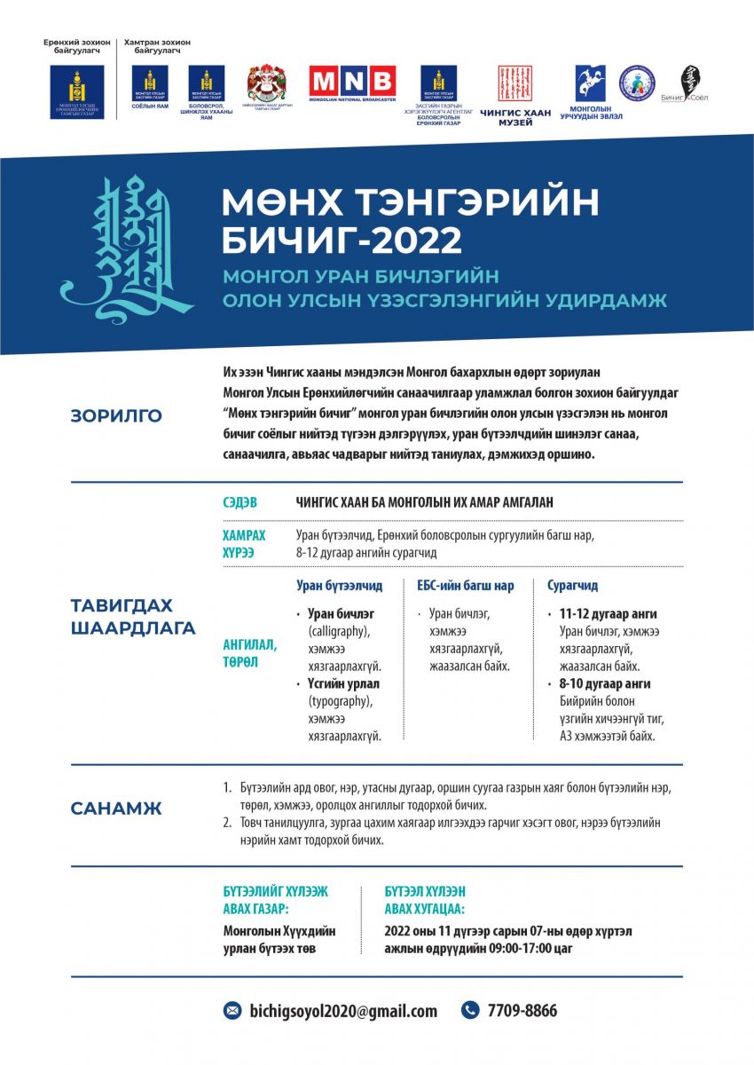 Их эзэн Чингис хааны мэндэлсний 860 жилийн ой, “Монгол бахархлын өдөр”-т зориулсан “Мөнх тэнгэрийн бичиг-2022” монгол уран бичлэгийн олон улсын үзэсгэлэнд 2022 оны 11 дүгээр сарын 07-ны өдөр хүртэл бүтээл хүлээн авна.