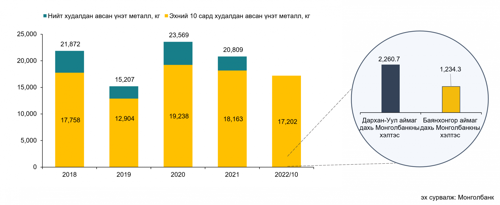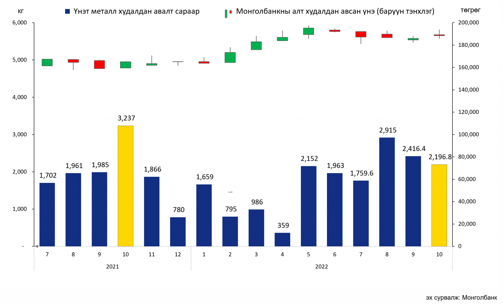 Монголбанк 2022 оны 10 дугаар сард 2,196.8 кг үнэт металл худалдан авч, оны эхнээс өссөн дүнгээр 17.2 тонн үнэт металл худалдан аваад байна. Энэ нь өмнөх оны мөн үетэй харьцуулбал 5 хувиар буурсан үзүүлэлт байна.