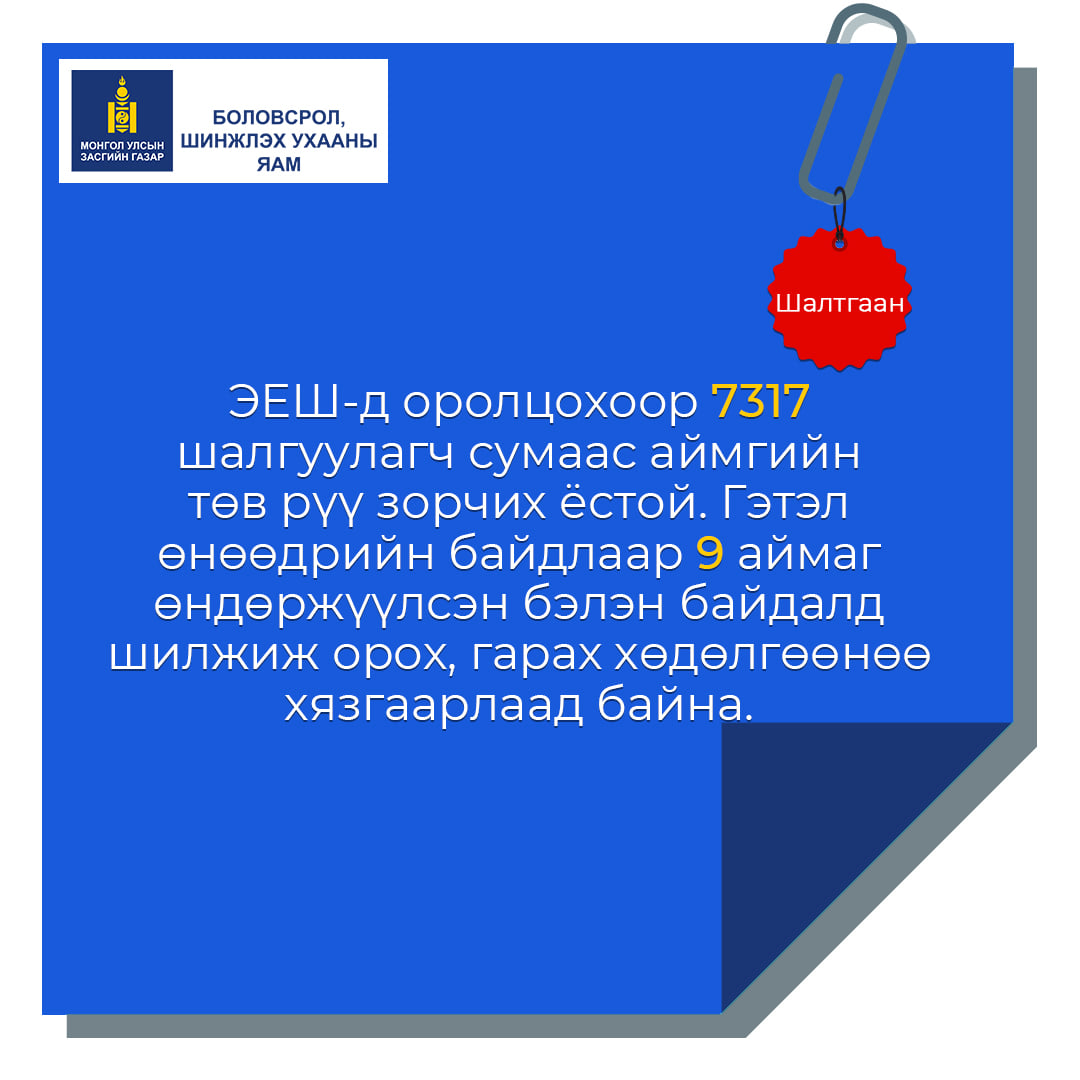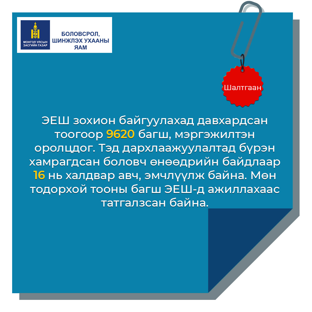 Нэг шалгуулагч дунджаар 2-3 шалгалт өгөх ба нэг шалгалтын үргэлжлэх хугацаа 80-100 минут байна. Шалгалтыг зохион байгуулахад 9620 багш, мэргэжилтэн оролцохоор холбогдох сургалтуудад хамрагдаж чиг үүргийн дагуу бэлтгэгдээд байна. Эрүүл мэндийн яамнаас авсан мэдээллээр ЭЕШ өгөхөөр бүртгүүлсэн иргэдийн 76.7 хувь нь дархлаажуулалтад хамрагдаад байна.