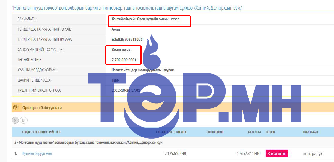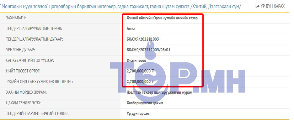 “Монголын нууц товчоо” цогцолборын интерьер, гадна тохижилт, гадна шугам сүлжээ 2.7 тэрбум төгрөгийн тендерийг Хэнтий аймгийн Орон нутгийн өмчийн газар захиалж, Байгаль орчин, аялал жуулчлалын яам тендер зарлажээ.