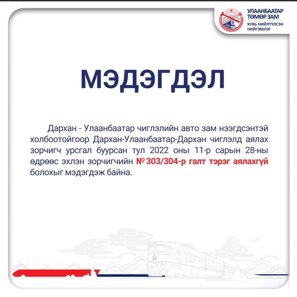 Тэгвэл "Авто замын бүтээн байгуулалт дуусч, ашиглалтад орсонтой холбогдуулан хурдны галт тэрэг тус чиглэлд явахгүй" гэж "УБТЗ" ХНН-ээс мэдэгдлээ. Тодруулбал, "Авто зам нээгдсэнтэй холбоотойгоор Дархан-Улаанбаатар-Дархан чиглэлд аялах зорчигчдын урсгал буурсан тул энэ сарын 28-наас эхлэн зорчигчийн №303/304 дүгээр галт тэрэг аялахгүй" хэмээв.