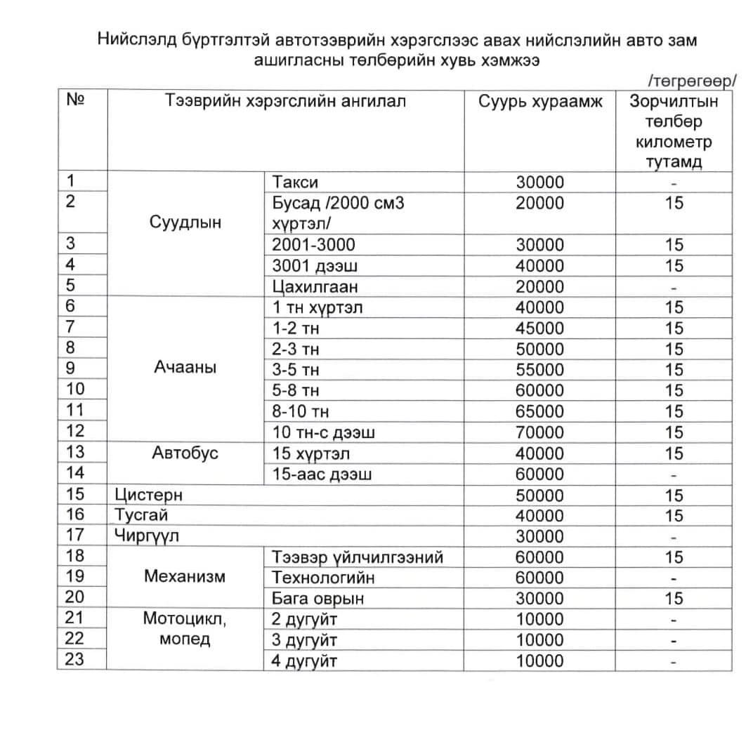 Харин орон нутгийн улсын дугаартай тээврийн хэрэгсэл 1 км тутамд 45 төгрөг төлөхөөр болжээ.