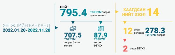 Нийт 14 зээлдэгчийн зээл хаагдсанаас 12 зээл нь бэлнээр буюу 278.3 тэрбум төгрөгөөр, 2 зээл нь өмчлөх бусад үл хөдлөх хөрөнгөөр хаагдаад байна.