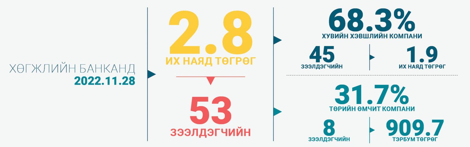 Хөгжлийн банк нь энэ сарын 28-ны байдлаар 53 зээлдэгчийн 2.8 их наяд төгрөгтэй тэнцэх хэмжээний багцын үлдэгдэлтэй байна. Үүнээс 31.7 хувь нь төрийн өмчит компанийн 8 зээлдэгчийн 909.7 тэрбум төгрөгийн, 68.3 хувь нь хувийн хэвшлийн 45 зээлдэгчийн 1.9 их наяд төгрөгийн зээл, хүүгийн үлдэгдэл байна.