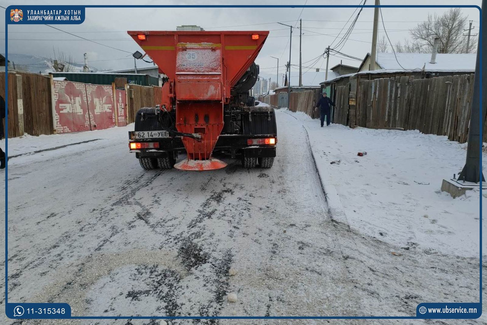 Улаанбаатарын зам талбайн цэвэрлэгээ хариуцдаг 18 байгууллага зориулалтын давс, бодис цацалтын ажлыг цас орохтой зэрэгцэн эхлүүлжээ.
