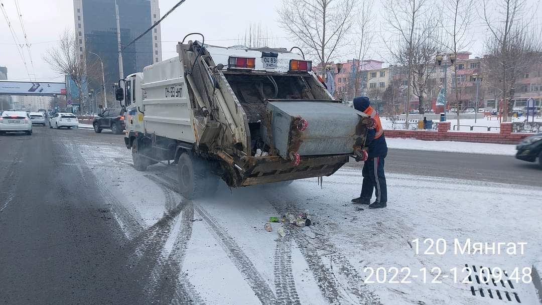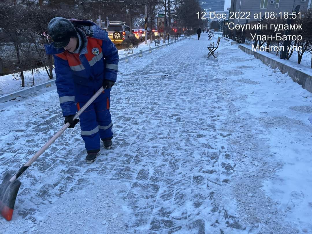 Улаанбаатар хот орчимд 2022 оны арванхоёрдугаар сарын 11-ний өглөөнөөс эхлэн цас орж, зам талбайд халтиргаа гулгаа үүссэн тул холбогдох байгууллагууд арга хэмжээ авч ажиллаж байна. Тодруулбал, хотын авто замын зорчих хэсэгт халтиргаа гулгаанаас сэргийлэх зориулалтын давс, бодис цацах үүрэг чиглэлийн дагуу зам талбайн цэвэрлэгээ хариуцан ажилладаг 18 байгууллагын 878 алба хаагч 72 машин техниктэйгээр 13.2 сая ам метр талбайн цэвэрлэгээг хийж гүйцэтгэлээ.