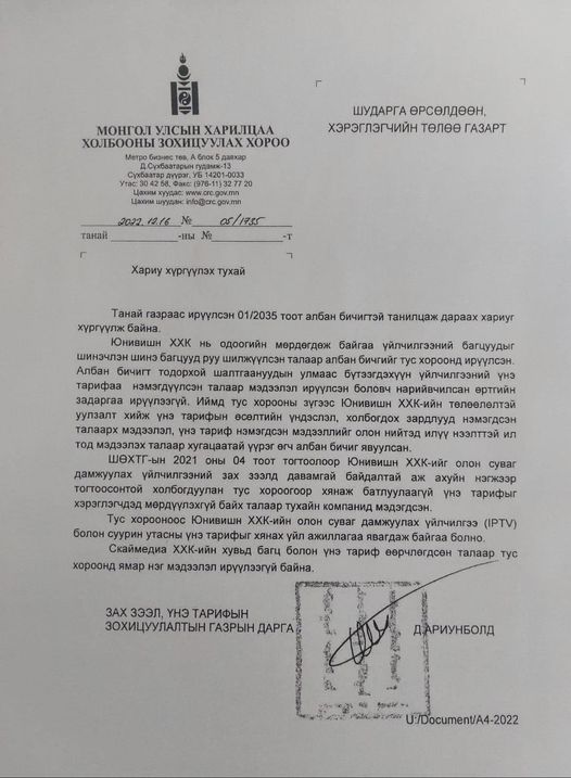 Иргэдээс ШӨХТГ-т ирүүлсэн "Юнивишн" ХХК нь хэрэглэгчдэд мэдээлэл өгөлгүй үнэ нэмсэн гэх гомдлыг хянаад хэрэглэгчдэд хангалттай мэдээлэл өгөөгүй гэх асуудалд нь ШӨХТГ-аас зөрчлийн хэрэг нээж, үнэ тарифаа хянуулаагүй нэмсэн асуудлыг нь харьяаллын дагуу Харилцаа холбооны зохицуулах хороонд хүргүүлсний хариуд ХХЗХ-оос дараах албан бичгийг ирүүлжээ.