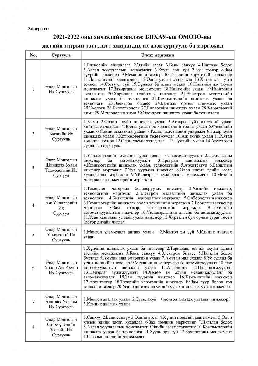 Монгол Улсын Боловсрол, шинжлэх ухааны яам, Бүгд Найрамдах Хятад Ард Улсын Өвөр Монголын Өөртөө Засах Орон (ӨМӨЗО)-ны Ардын Засгийн газар хоорондын хэлэлцээрийн дагуу 2021-2022 оны хичээлийн жилээс БНХАУ-ын ӨМӨЗО-ны Ардын Засгийн газрын тэтгэлгээр бакалаврын сургалтад суралцуулах сонгон шалгаруулалтыг зарлаж байна. Бакалаврын хөтөлбөрт 1 жилийн хэлний бэлтгэл, 4 жилийн үндсэн сургалт багтана.