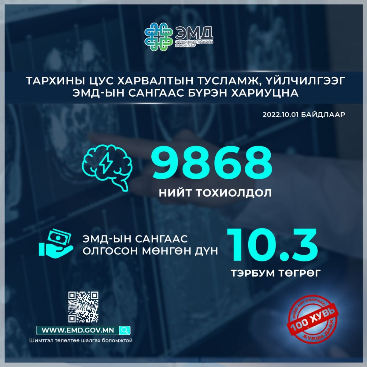 2022 оны эхний 10 сарын байдлаар энэхүү тусламж, үйлчилгээний 9868 тохиолдол бүртгэгдэж, ЭМД-ын сангаас 10.3 тэрбум төгрөгийн санхүүжилт олгосон байна.