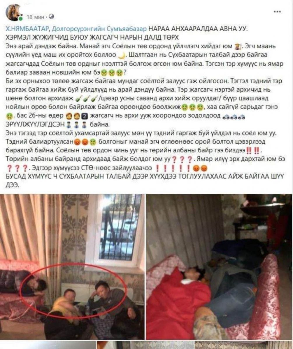 Тэдний балиартуулсан болгоныг манай эгч өглөөнөөс орой болтол цэвэрлээд барахгүй байна. Соёлын төв ордон чинь уг нь төрийн албаны байр гээ биз дээ‼️‼️. Төрийн албаны байранд архидаад байж болдог юм уу? Ямар илүү эрх дархтай юм бэ?. Эдгээр хүмүүсээ СТӨ-нөөс зайлуулаач ээ! Бусад хүмүүс ч Д.Сүхбаатарын талбай дээр хүүхдээ тоглуулахаас айж байгаа шүү дээ" хэмээн бичжээ.