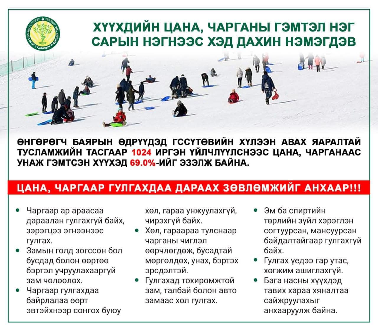 ГССҮТ-д шинэ жилийн баярын үеэр 1024 иргэн үйлчлүүлснээс 700 орчим нь цана, чарганаас унаж, гэмтсэн хүүхэд байжээ. Сурагчдын амралт эхэлсэнтэй холбоотойгоор иргэд агаар салхинд гарч, гулгах тохиолдол өсөж, түүнийг дагаад гэмтэл, бэртлийн тоо ч нэмэгдэж байгаа тул ГССҮТ-өөс эцэг эх, асран хамгаалагчдад хандан дараах зөвлөмжийг гаргажээ.