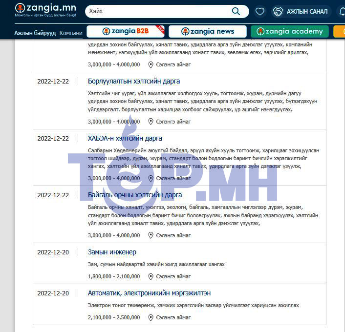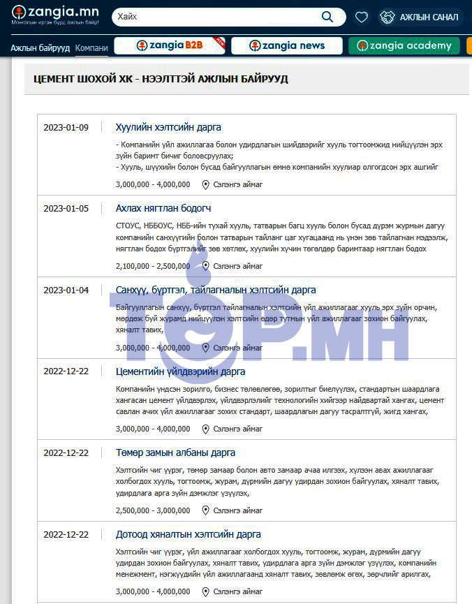 Санхүү, бүртгэл, тайлагналын хэлтсийн дарга, Ахлах нягтлан бодогч, Хуулийн хэлтсийн дарга, Цементийн үйлдвэрийн дарга, Төмөр замын албаны дарга, Борлуулалтын хэлтсийн дарга зэрэг “ДАРГЫН ЗАР” ихээр байршсан байгааг та харж байна.