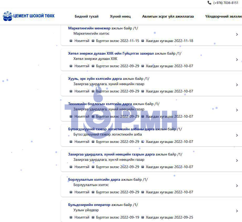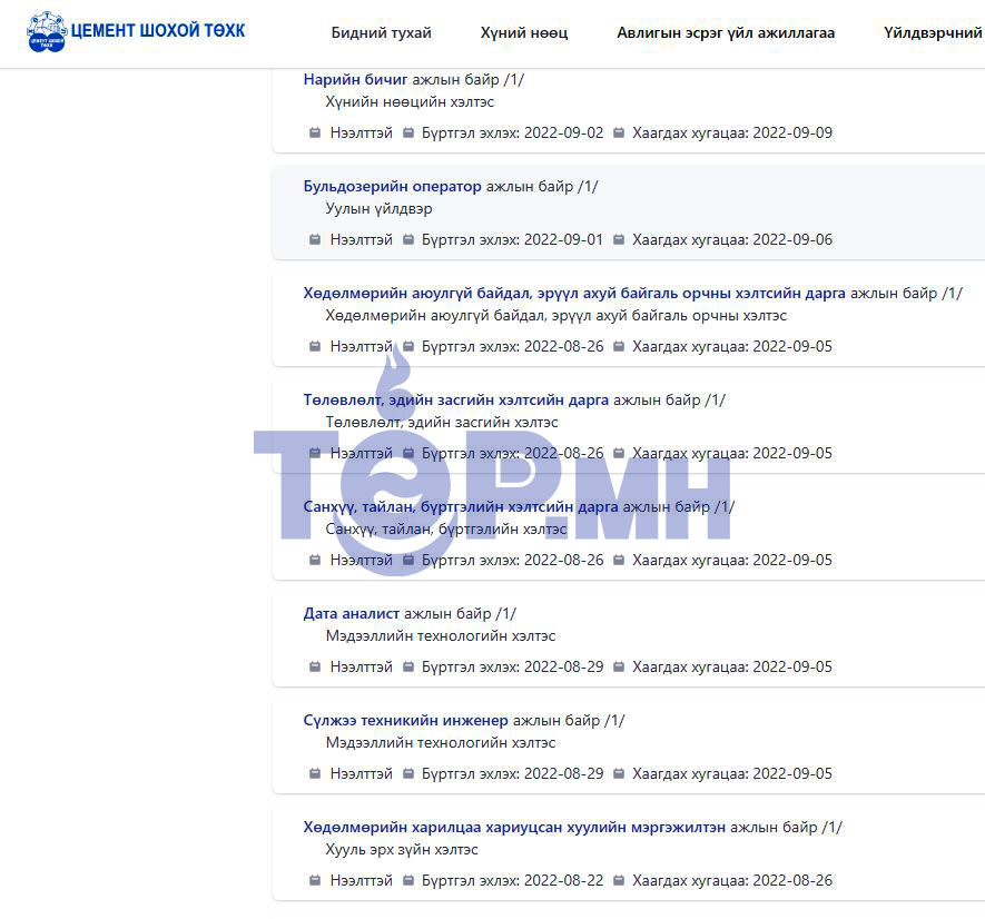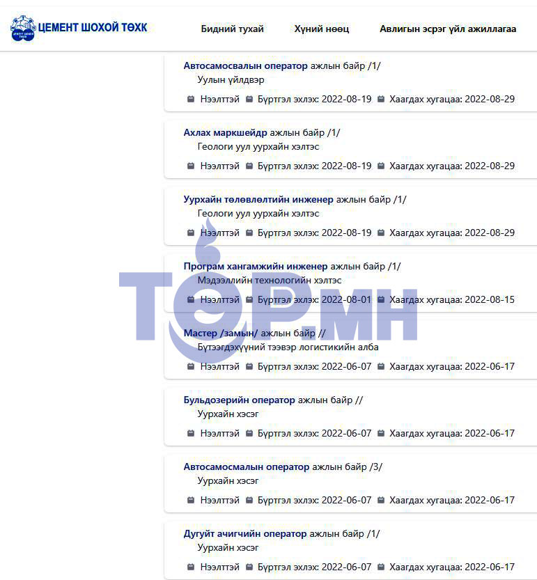 Ажлын байрны нээлттэй зар дунд Хөтөлийн “Цемент шохой” ТӨХК-ийн зарласан ажлын байрны зар анхаарал татна.