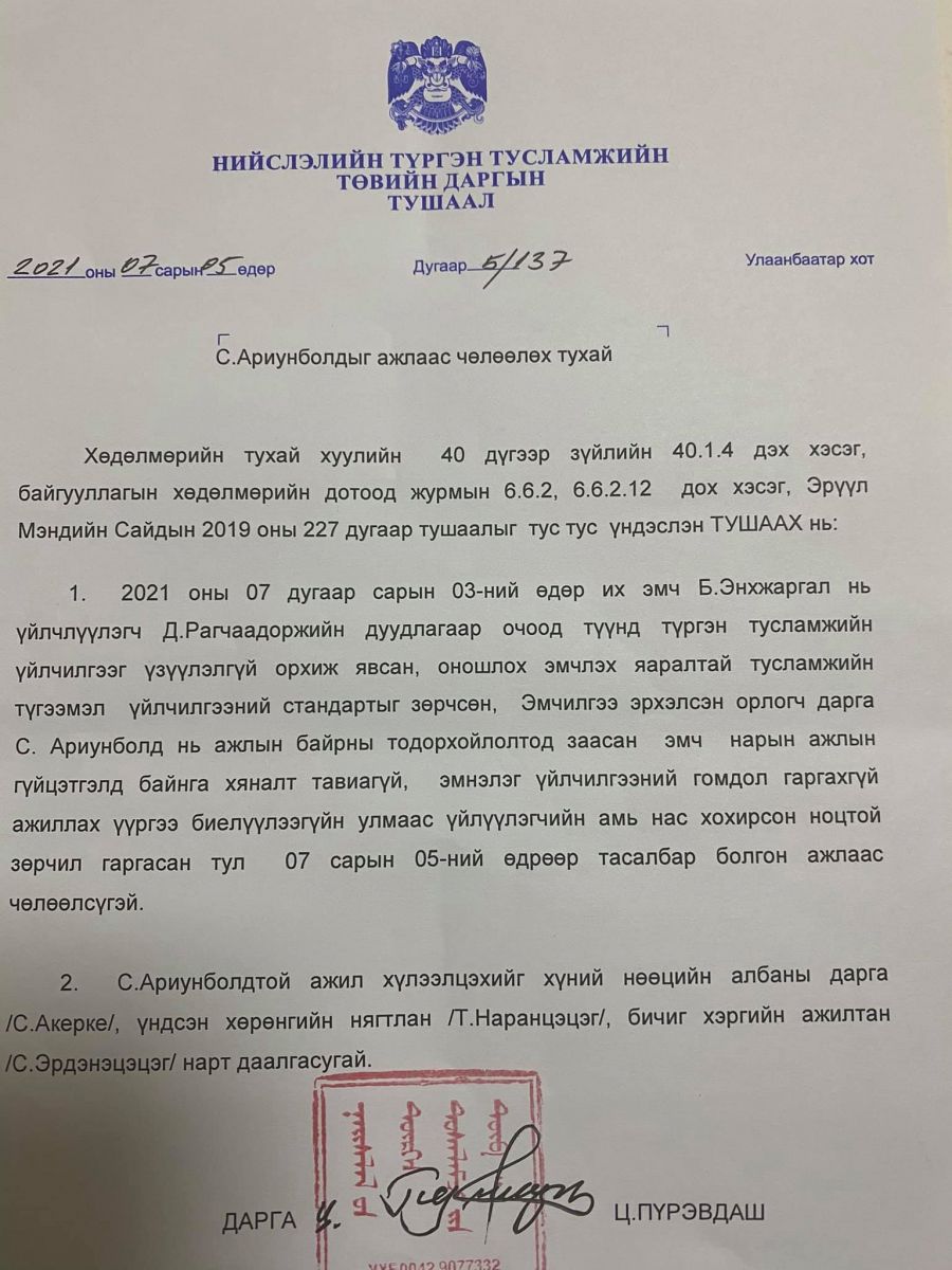 Нийслэлийн түргэн тусламжийн төв буюу “103” -ын эмчилгээ эрхэлсэн орлогч дарга С.Ариунболд нь ажлын байрны тодорхойлолтод заасан эмч нарын ажлын гүйцэтгэлд байнга хяналт тавиагүй, эмнэлэг үйлчилгээний гомдол гаргахгүй ажиллах үүргээ биелүүлээгүйн улмаас үйлчлүүлэгчийн амь нас хохирсон ноцтой зөрчил гаргасан тул долдугаар сарын 5-ны өдөр ажлаасаа чөлөөлөгджээ.