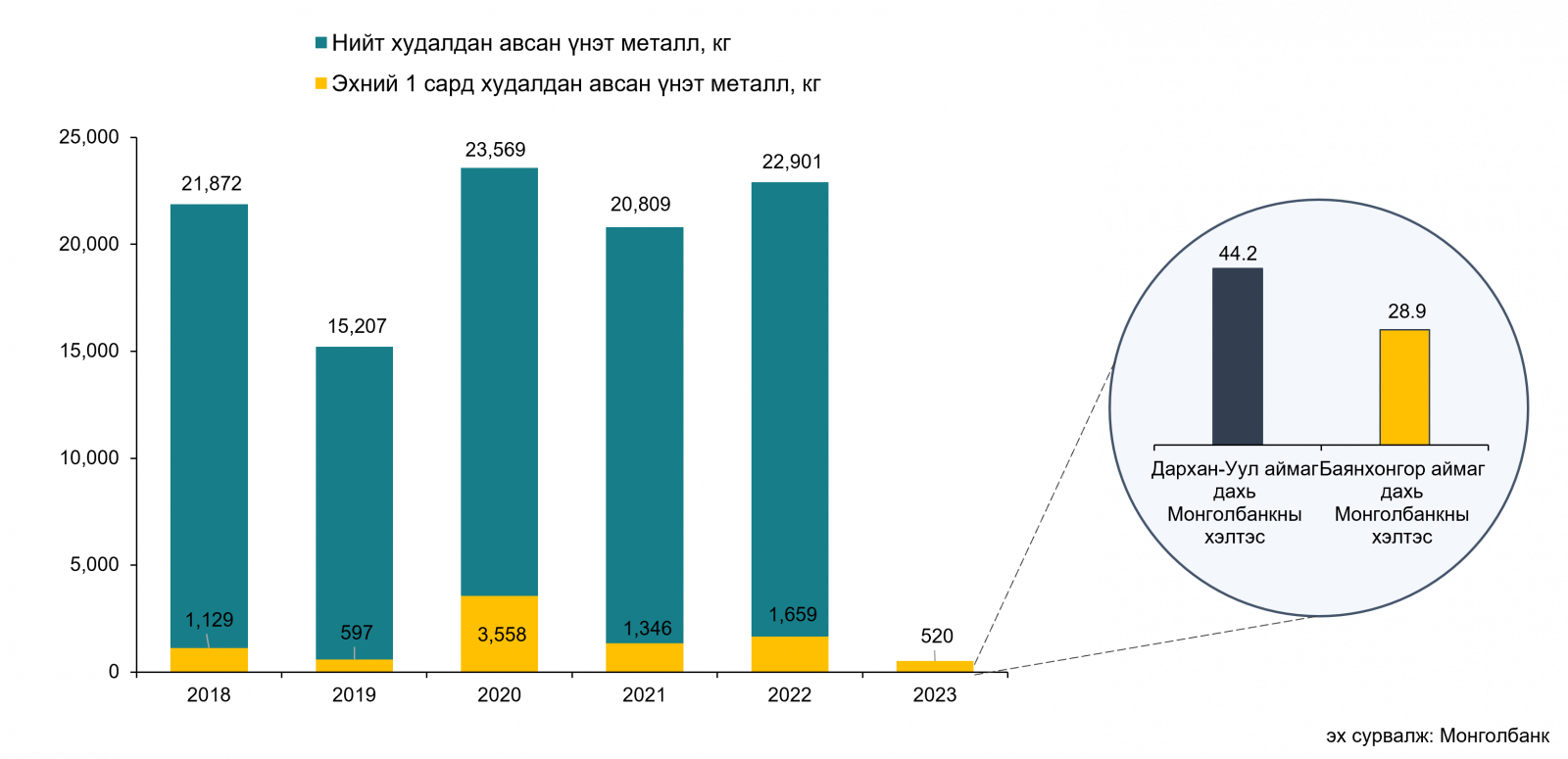 Монголбанк 2023 оны 1 дүгээр сард нийт 519.8 кг үнэт металл худалдан аваад байна. Дархан-Уул аймаг дахь Монголбанкны хэлтэс 44.2 кг, Баянхонгор аймаг дахь Монголбанкны хэлтэс 28.9 кг үнэт металл тус тус худалдан авсан.