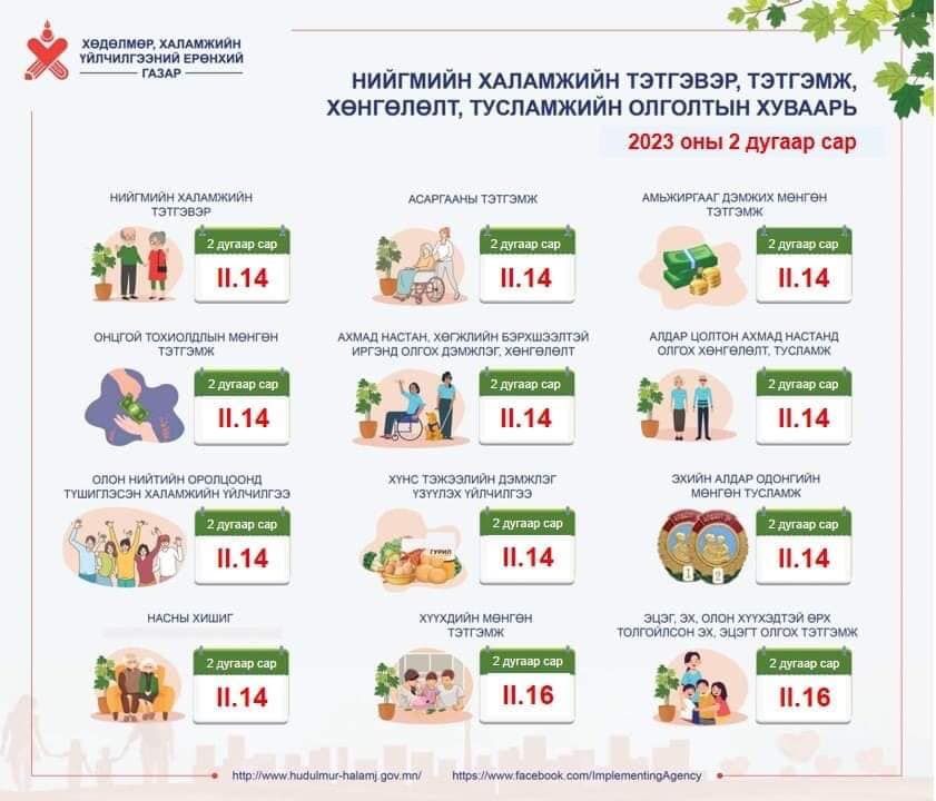 Хөдөлмөр, халамж үйлчилгээний газраас энэ сард тэтгэвэр, тэтгэмж олгох хуваарийг танилцуулав.