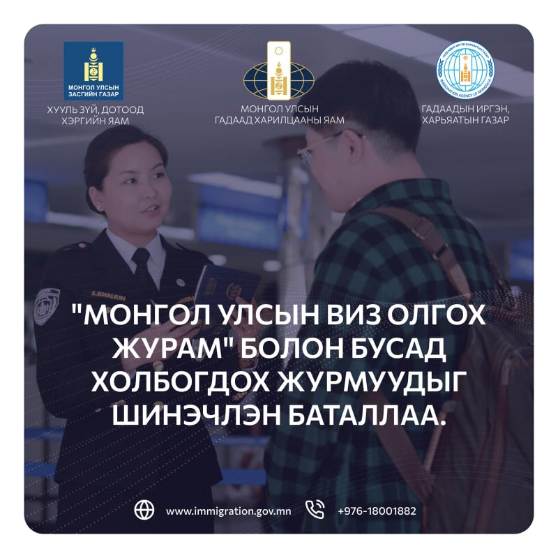Улсын Их Хурлаас Гадаадын иргэний эрх зүйн байдлын тухай хуульд нэмэлт, өөрчлөлт оруулах тухай хуулийг 2020 оны 12 дугаар сарын 31-ний өдөр баталсантай холбогдуулан Хууль зүй, дотоод хэргийн яам Гадаад харилцааны яамтай хамтран шинэчлэн боловсруулсан “Монгол Улсын виз олгох журам”, “Гадаадын иргэн Монгол Улсад оршин суух болон түүнийг бүртгэх журам”, “Гадаадын иргэнийг Монгол Улсаас албадан гаргах, албадан гаргахаас чөлөөлөх болон Монгол Улсад дахин оруулахгүй байх хугацааг тогтоох журам”-ын төслүүдийг Засгийн газар 2021 оны 07 дугаар сарын 07-ны өдрийн хуралдаанаар хэлэлцэн баталлаа.