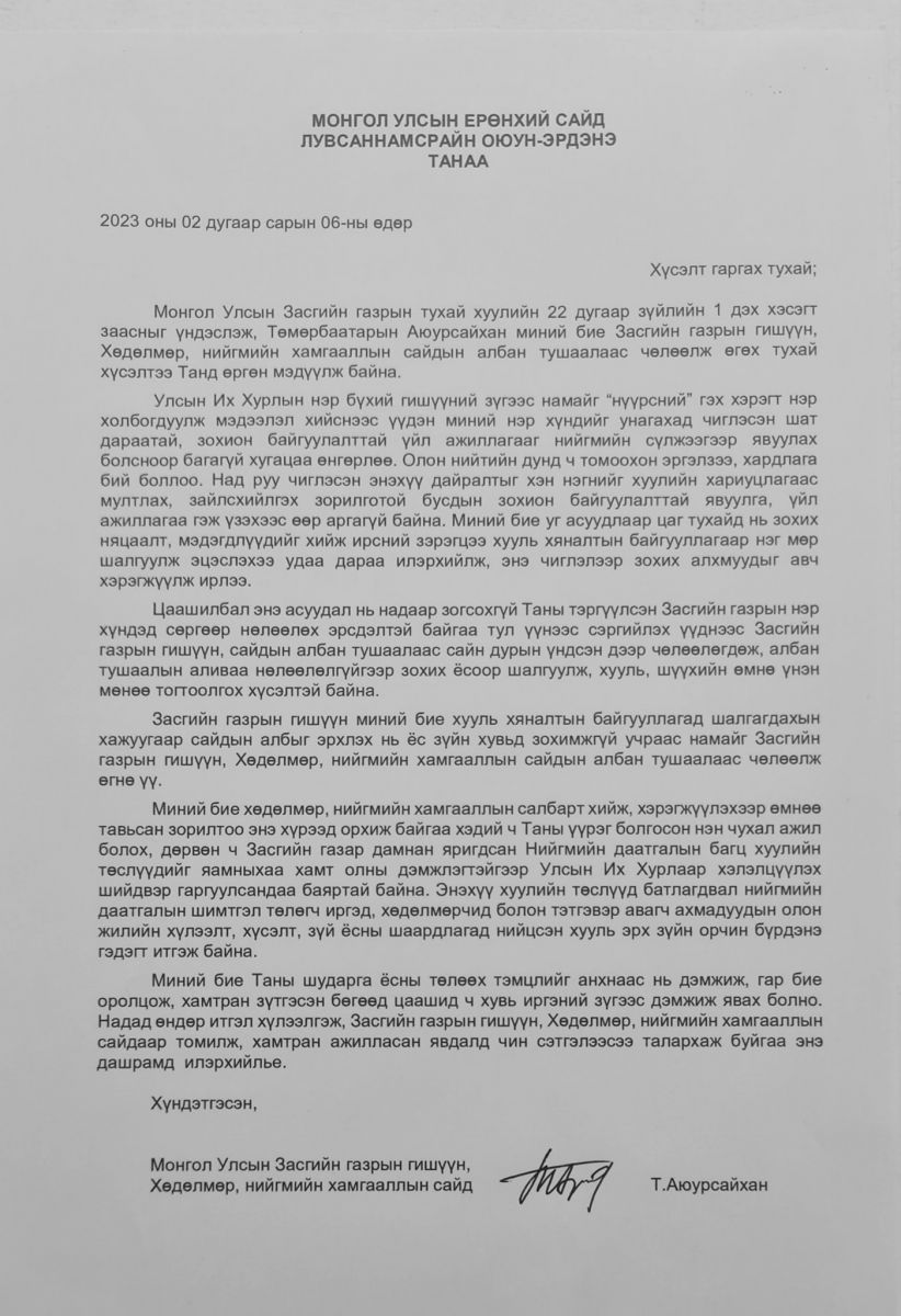 Засгийн газрын гишүүн миний бие хууль хяналтын байгууллагад шалгагдахын хажуугаар сайдын албыг эрхлэх нь ёс зүйн хувьд зохимжгүй учраас Засгийн газрын гишүүн, Хөдөлмөр, нийгмийн хамгааллын сайдын албан тушаалаас чөлөөлөгдөх хүсэлтээ гаргалаа.