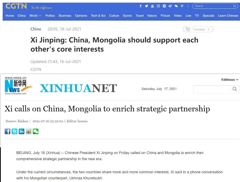 Тухайлбал, CGTN сувгийн вэбсайтад гарсан мэдээнд: “БНХАУ, Монгол Улс нь тусгаар тогтнол, бүрэн эрхт байдал, газар нутгийн бүрэн бүтэн байдал, язгуур ашиг сонирхлыг харилцан хүндэтгэхийн хажуугаар Иж бүрэн стратегийн түншлэлээ баяжуулан хөгжүүлэх” талаар БНХАУ-ын дарга Ши Жиньпин онцолсон гэжээ.