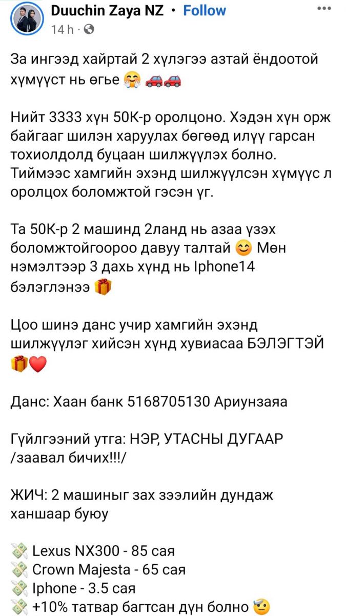 Иргэдийн амьжиргаа доройтож, бэлэн мөнгөний эрэлт ихсэж, БАЙР, МАШИН мөрөөдөл болсон. Үүнийг "овжин" аргаар ашиглах гэсэн хувь хүн, ААН-үүд олон янзын "СУГАЛАА" зохион байгуулж эхэлсэн. Телевизийн сувгууд болон цахим хуудсаараа гэх мэт олон аргаар...