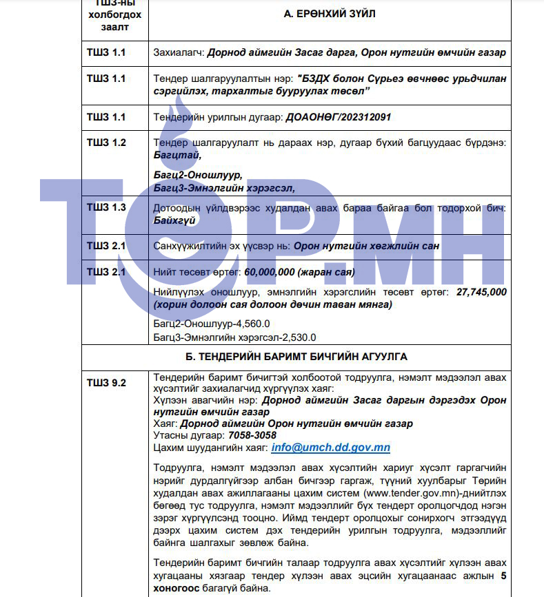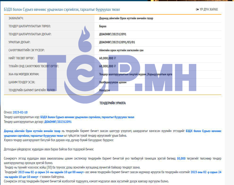 Энэ оны хоёрдугаар сарын 10-ны өдөр “Бэлгийн замаар дамжих халдварт өвчин болон Сүрьеэ өвчнөөс урьдчилан сэргийлэх, тархалтыг бууруулах төсөл”-ийн хүрээнд Орон нутгийн хөгжлийн сангийн хөрөнгөөс 60 сая төгрөгийн тендер зарлажээ.