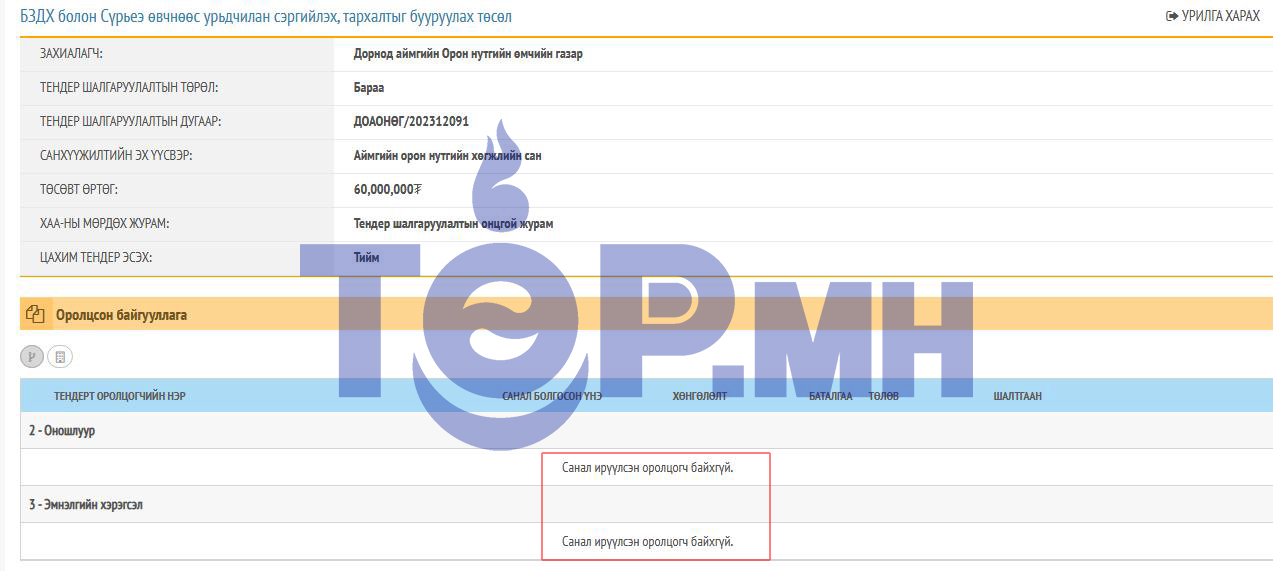 Энд оношлуур, эмнэлгийн хэрэгсэл авах бөгөөд энэ сарын 24-ны 10 цагт тендер хаагдсан ч тендерт нэг ч байгууллага оролцоогүй тендер хаагдсан байна. Эрүүл мэндэд анхаарах, урьдчилан сэргийлэх нь зөв. Гэвч тендер зарлахдаа цаг үеэ мэдэрсэнгүй юу зарласан тендер оролцогчгүй болж...