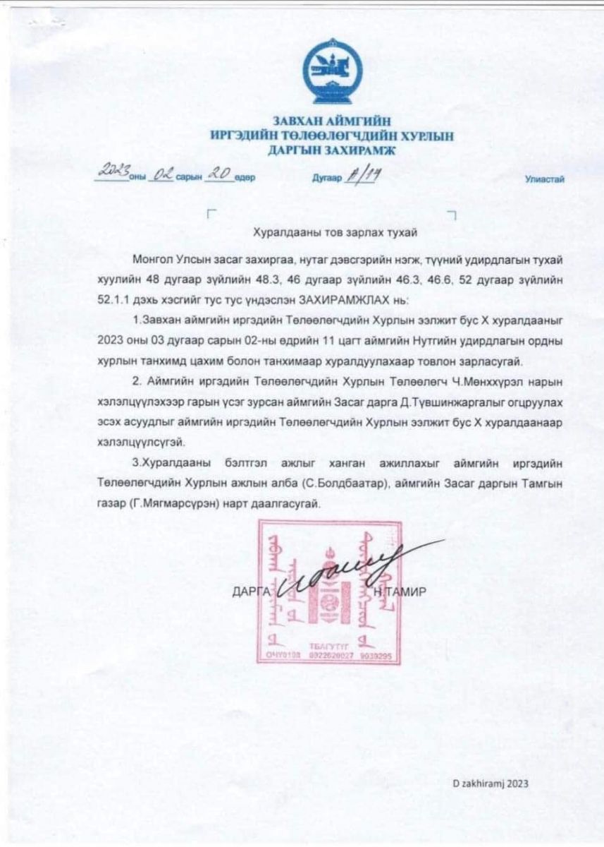 энэ пүрэв гараг /2023.03.02/-т аймгийн ИТХ хуралдаж, Засаг дарга Д.Түвшинжаргалыг чөлөөлөх асуудлыг хэлэлцэхээр болжээ.