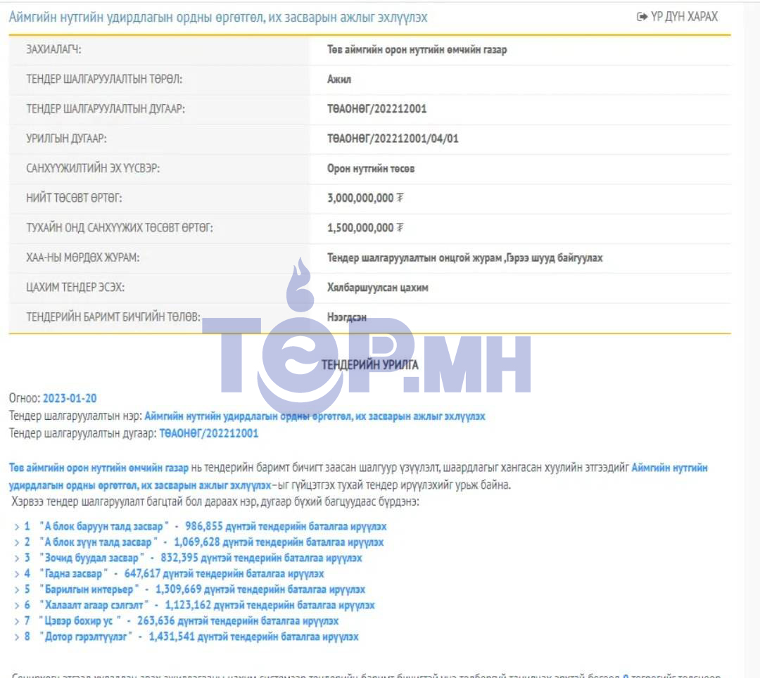Тэгвэл Д.Мөнхбаатар Засаг даргатай Төв аймгийнхан Нутгийн удирдлагын ордноо өргөтгөж, засварлахад 3 ТЭРБУМ төгрөг зарцуулахаар ТЕНДЕР зарлажээ.